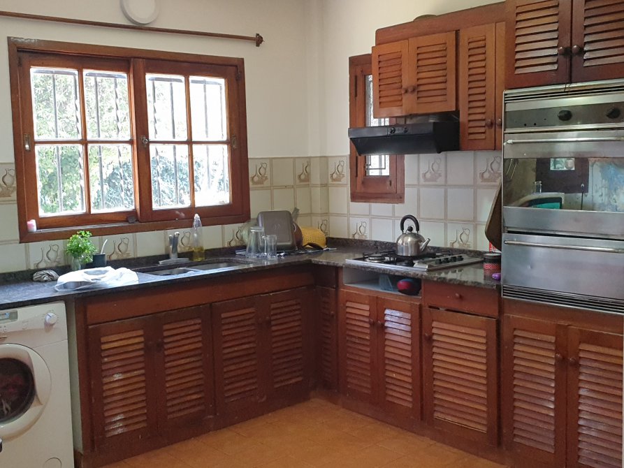 COCINA COMEDOR CON MUEBLES DE CEDRO.COMEDOR CON VENTANAS BALCON AL JARDIN.