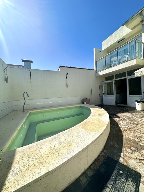 El jardín cuenta con una parrilla de gran tamaño y un sistema de grifería completo. Además, se encuentra una gran piscina tipo jacuzzy con hidromasajes, todo cubierto de venecitas.