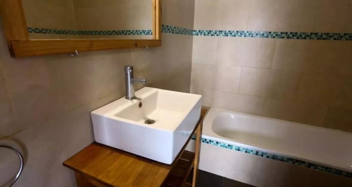 Baño: Mueble de madera con bacha de loza y bañera enlozada de 1,70 metros de largo.