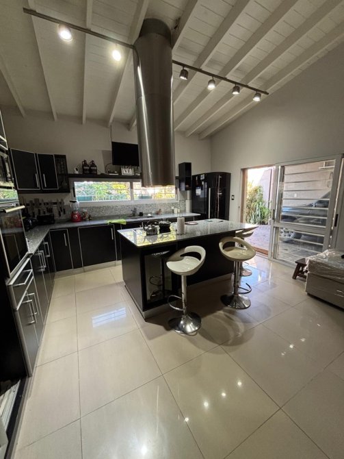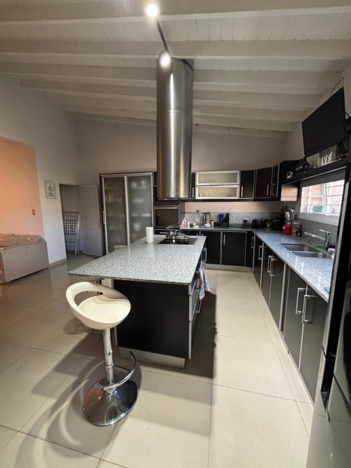 Cocina moderna con isla central, totalmente equipada con muebles bajo mesada y alacenas de