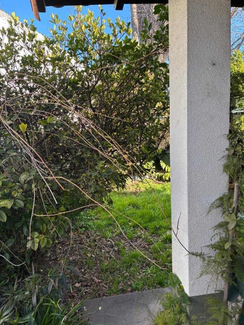 independiente y baño completo. Al frente presenta jardín parquizado, rejas y acceso peatonal, además de garaje cubierto con
