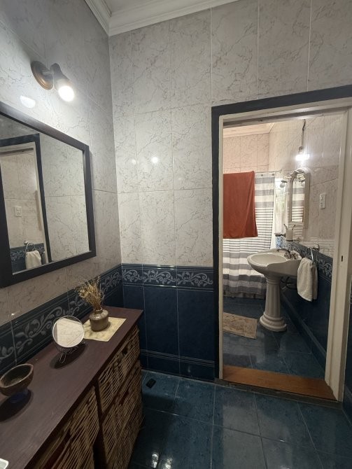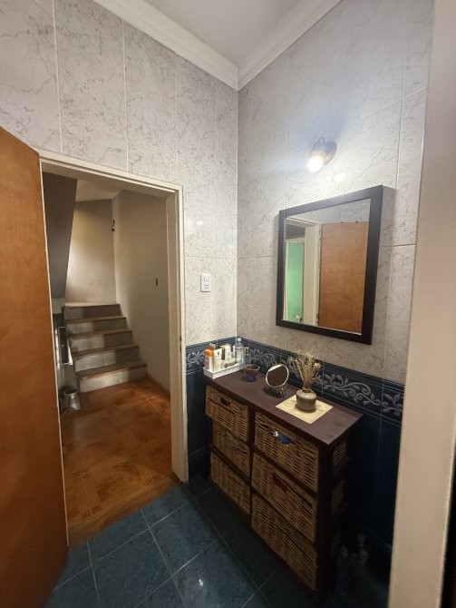 En planta alta se distribuyen cuatro dormitorios —originalmente proyectados como tres, con divisiones posteriores—, destacándose el dormitorio principal que cuenta con patio terraza y balcón. Completa este nivel un baño completo con antebaño, adecuado para el uso familiar.