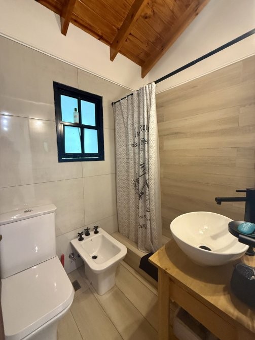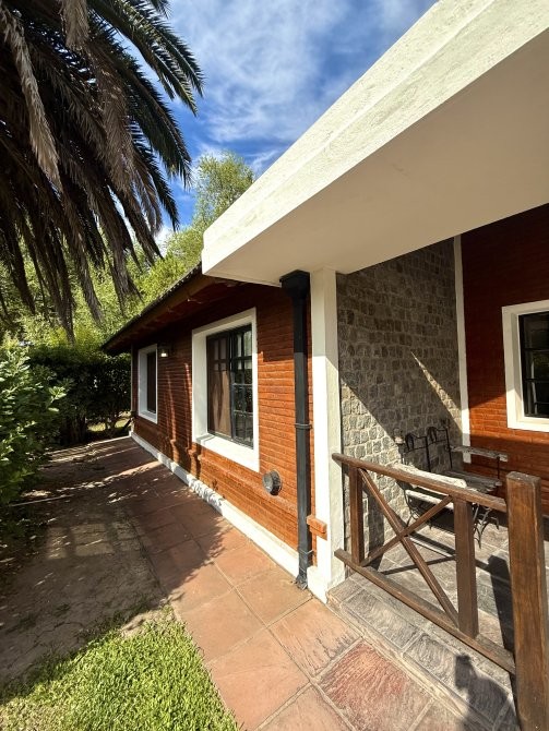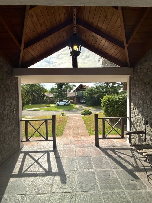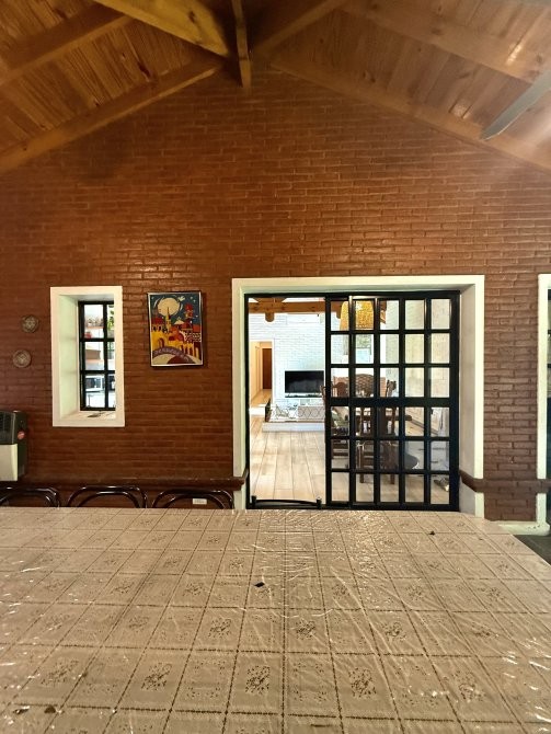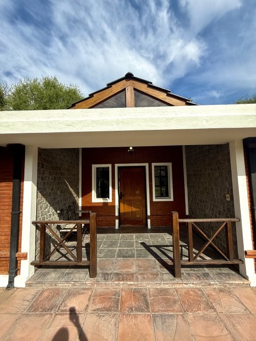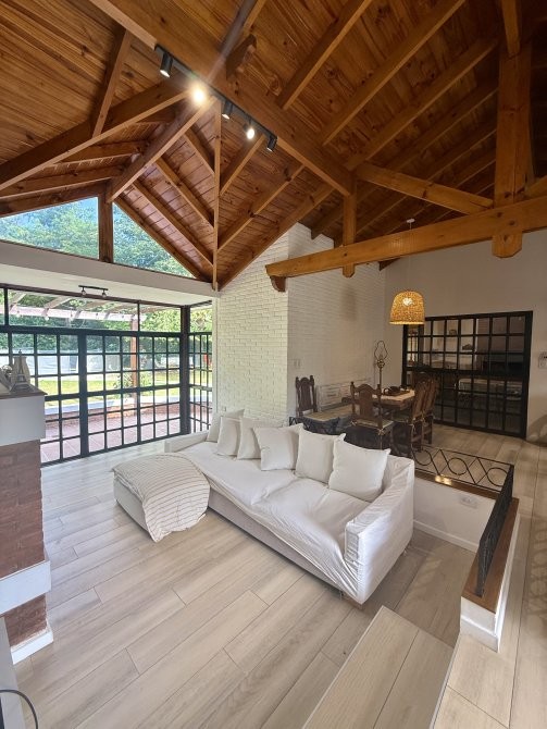 La casa se distingue por una combinación armónica de materiales nobles como adoquines, ladrillo visto, lajas, madera y hierro, logrando una estética cálida y auténtica. Los techos de madera, con diferentes alturas y pendientes, aportan dinamismo espacial y jerarquizan los ambientes principales. Las aberturas, que combinan madera y hierro con vidrios repartidos, permiten un excelente ingreso de luz natural y refuerzan el carácter acogedor de la vivienda.