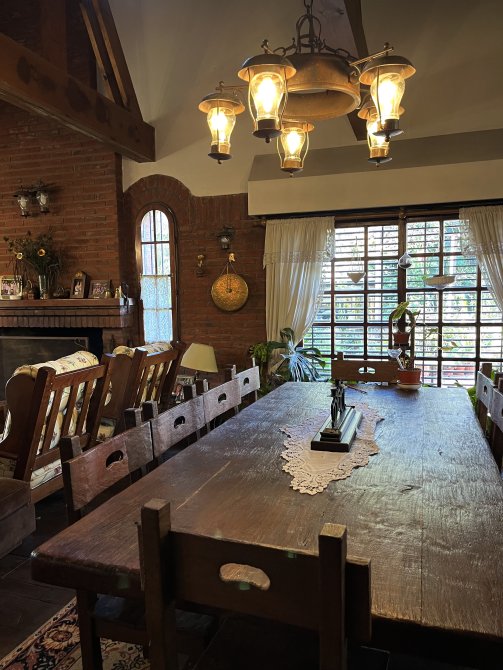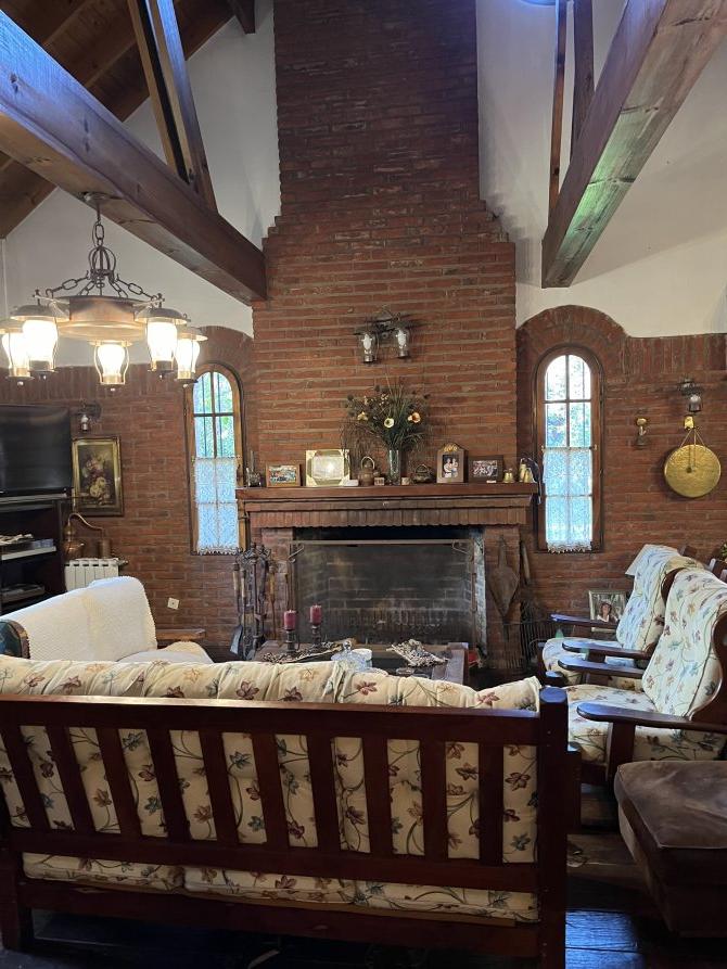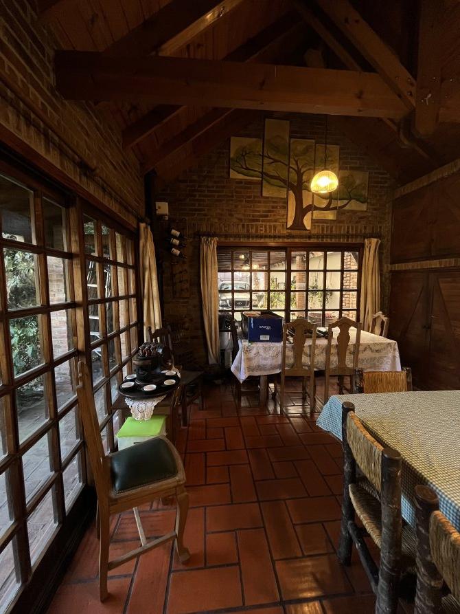 C) A la derecha al living comedor, con bar, pisos de algarrobo entarugados, hogar a leña, ventana bow windou al frente y puerta ventana doble atrás, que da a un patio redondo de 70 M2 con bancos maceteros de material.