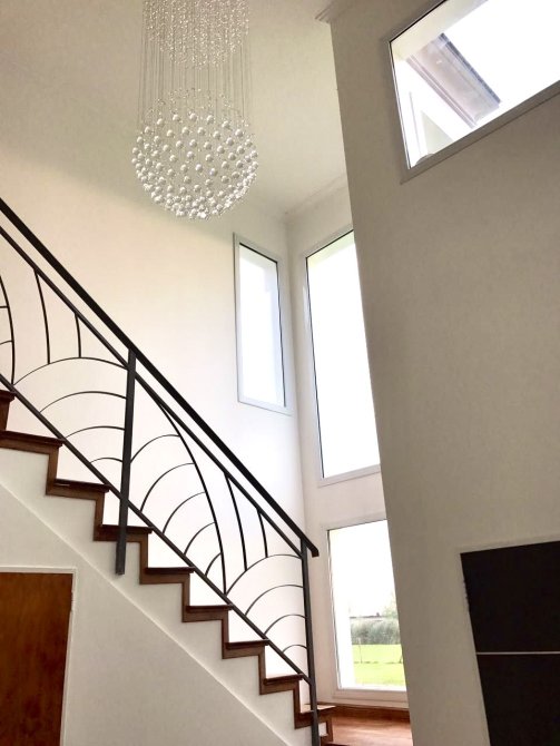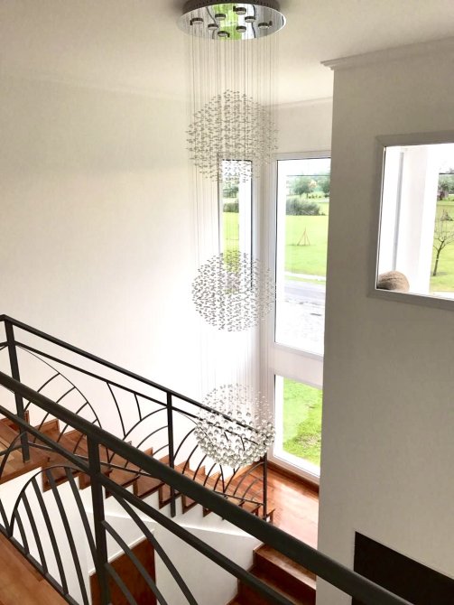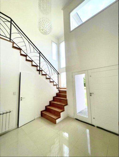Amplio living comedor de doble altura con ventanales al jardín, toilette de recepción y espacio de guardado. Escalera revestida en madera de viraró y barandas de diseño contemporáneo.