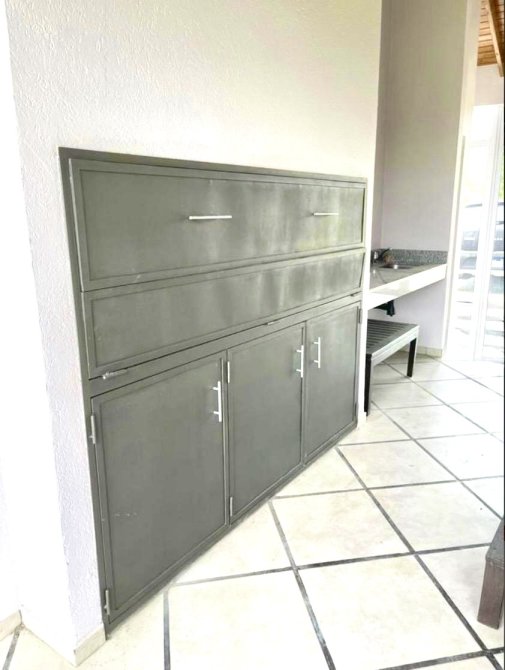 Quincho cerrado de 32 m² con parrilla embutida, mesada en mármol, bacha, muebles bajo mesada y baño completo.