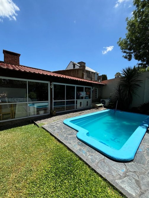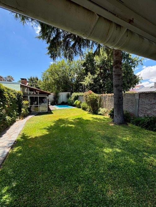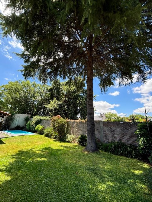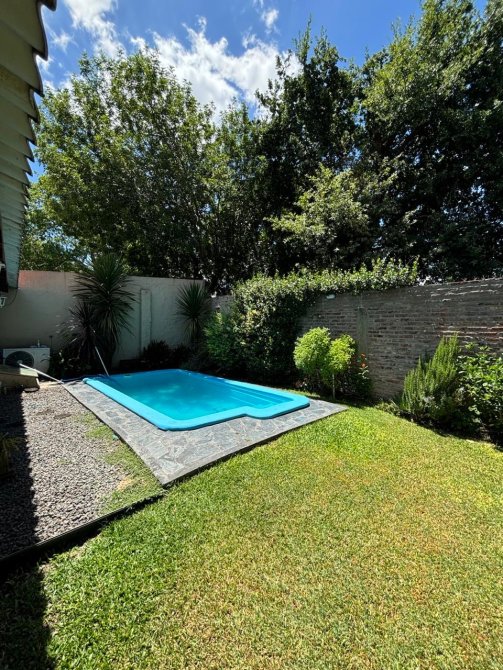 El jardín trasero se encuentra excelentemente parquizado, con piscina de fibra equipada con sistema de filtrado y un quincho cubierto con capacidad para 15 a 20 personas, ideal para reuniones familiares o sociales.